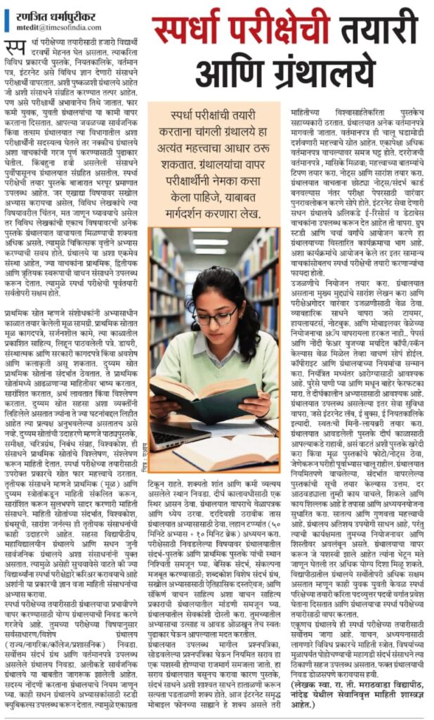 स्पर्धा परीक्षेची तयारी आणि ग्रंथालयेBy Dr. Pravin Ghule / November 1, 2025 संदर्भ- दैनिक महाराष्ट्र टाईम्स, मुंबई आवृत्ती शनिवार, दि.०१-११-२०२५, पान नं-११