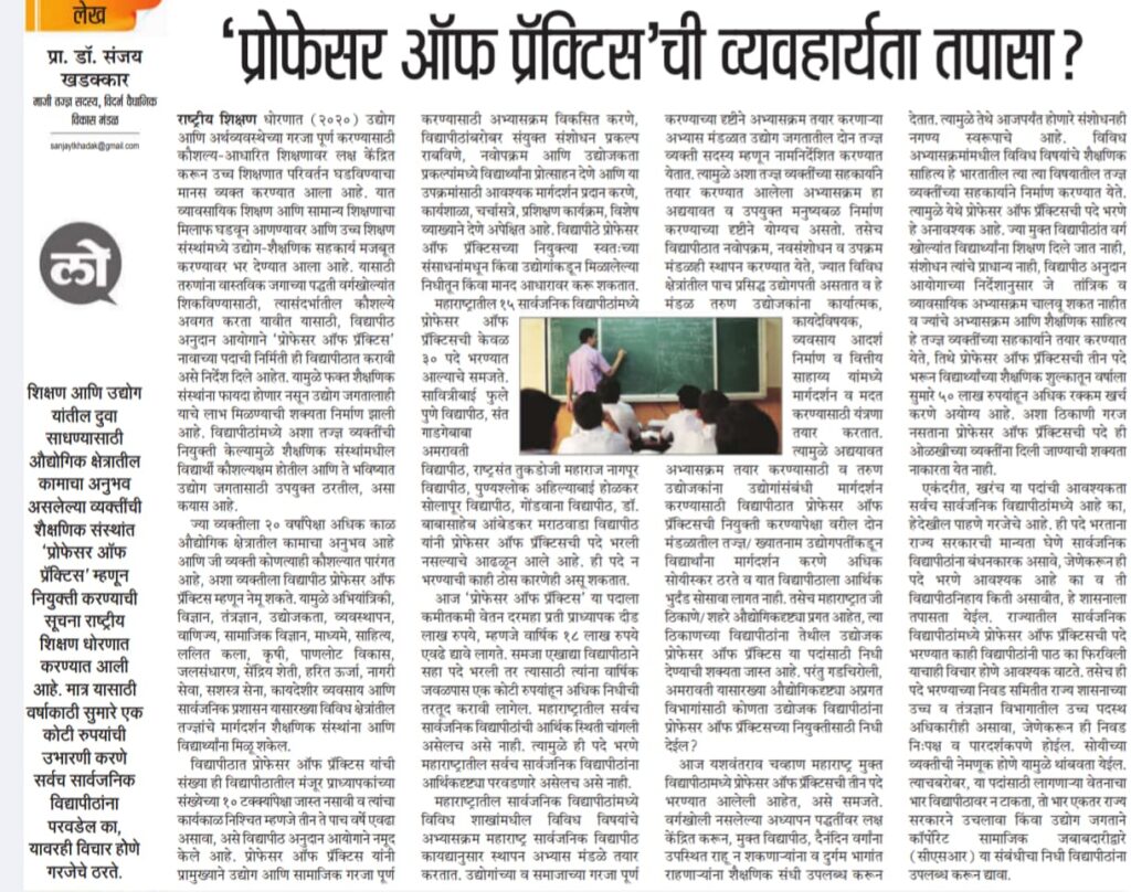 ‘प्रोफेसर ऑफ प्रॅक्टिस’ ची व्यवहार्यता तपासा?By Dr. Pravin Ghule / February 3, 2026 Source : Loksatta, Pune, 03/02/2026